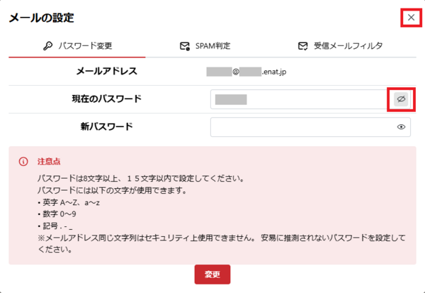 5.現在のパスワードの右横にある「目玉アイコン」をクリックする事によりメールアドレスのパスワードを表示される事ができます。