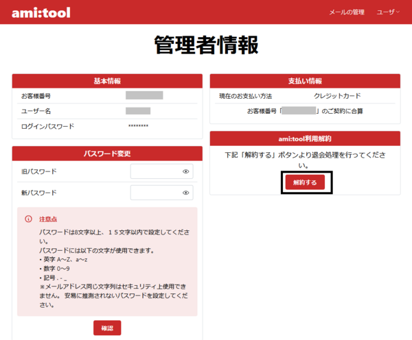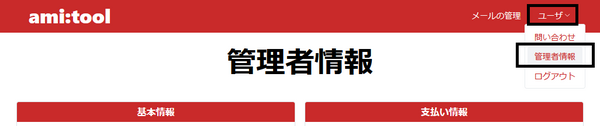 3.右上のメニューから「ユーザ」の中にある「管理者情報」を選択します。次の画面でami:tool利用解約から「解約する」ボタンをクリックします。
