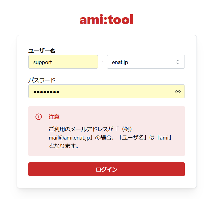 1.ami:toolユーザーログインから「ユーザー名」と「パスワード」を入力した後「ログイン」ボタンをクリックします。