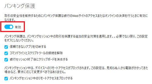 6.「無効」にした後に該当のページを開き情報が表示されるか確認をした後、バンキング保護を再び「有効」に戻す