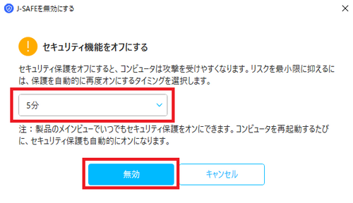 5.セキュリティ機能を一時的にオフにする時間(例:5分)を選択した後「無効」ボタンをクリックします
